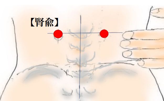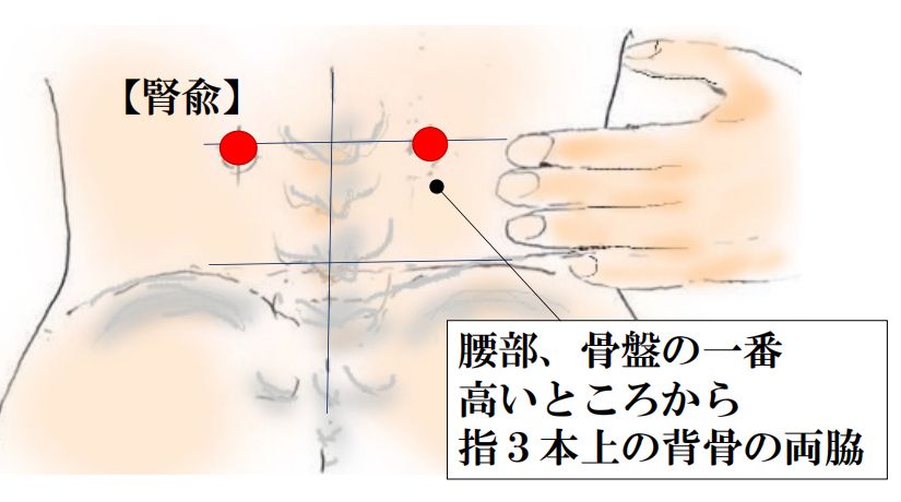 ※正確な取穴方法は、第2腰椎棘突起下方の陥凹部(【命門】)の外方1.5寸(第二関節の指の幅、約2本分)です