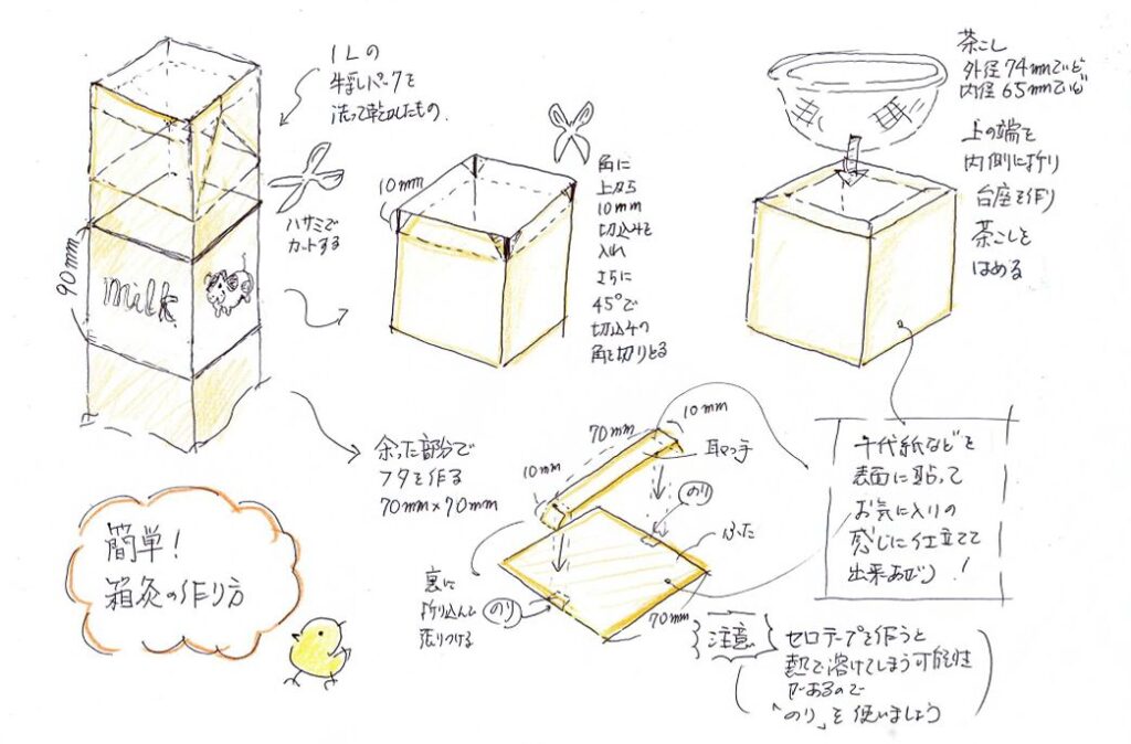 5.牛乳バックの余った部分を70mm×70mmの正方形に切り取りふたを作ります