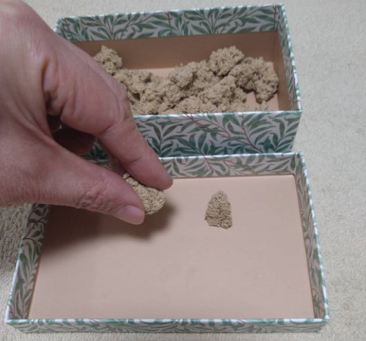 【1】 もぐさを親指の先くらいの大きさに指先で取り、三角形にカタチを整えます(形がまとまる程度)