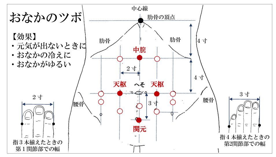 おへその下あたり(【気海】や【関元】)おへその上(【中脘】)などがポイントになりますが、あまり気にせず、お腹の冷えているところ、ぐりぐりして痛いところ、へなっと弱いところに置くのが良いです